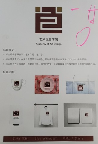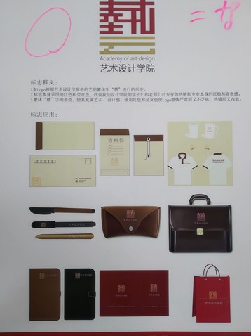 标志采用大红、灰黄以及墨黑三种颜色,用来表现学院未来发展红红火火、金碧辉煌。标志给人方正有圆滑,蓬勃向上旭日阳刚的感觉,正是体现了我们艺术设计学院的朝气蓬勃之感。